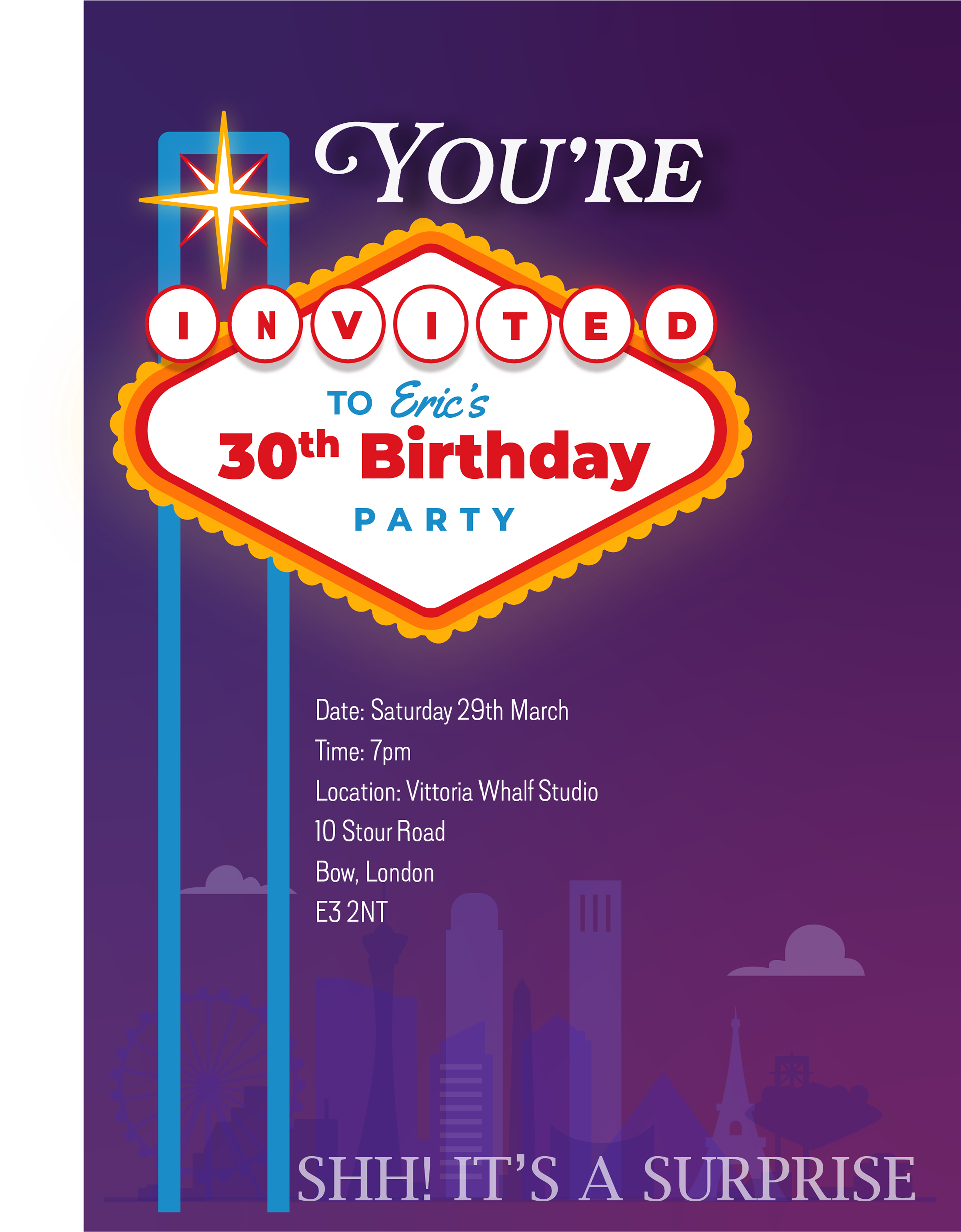 Goal: Create a Las Vegas-themed Flyer for a surprise 30th birthday.